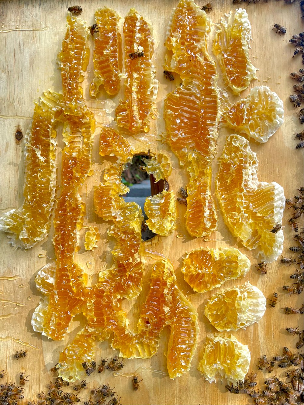This small harvest was freeform sculptures of honeycomb throughout the hive, and after careful extraction to maintain as much shape as I could, I squished and strained the rest by hand to share their hard work!