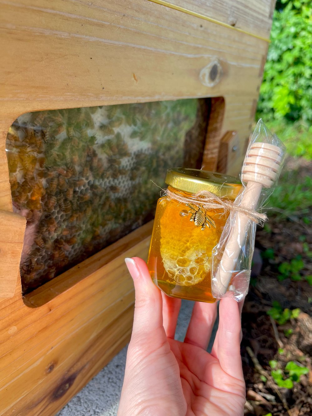 3oz Raw honeycomb jars of pure liquid Virginia gold! Each jar has at least a quarter size of capped honeycomb topped with a charm and honey stir! 🍯