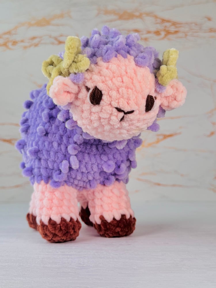 This handmade crocheted sheep is just absolutely adorable and can stand on it's own! Soft calming lavender fields was the inspiration of this color scheme. This sheep is created with many loop stitches, handmade bows and a hand stitched face! Includes a rattle inside!