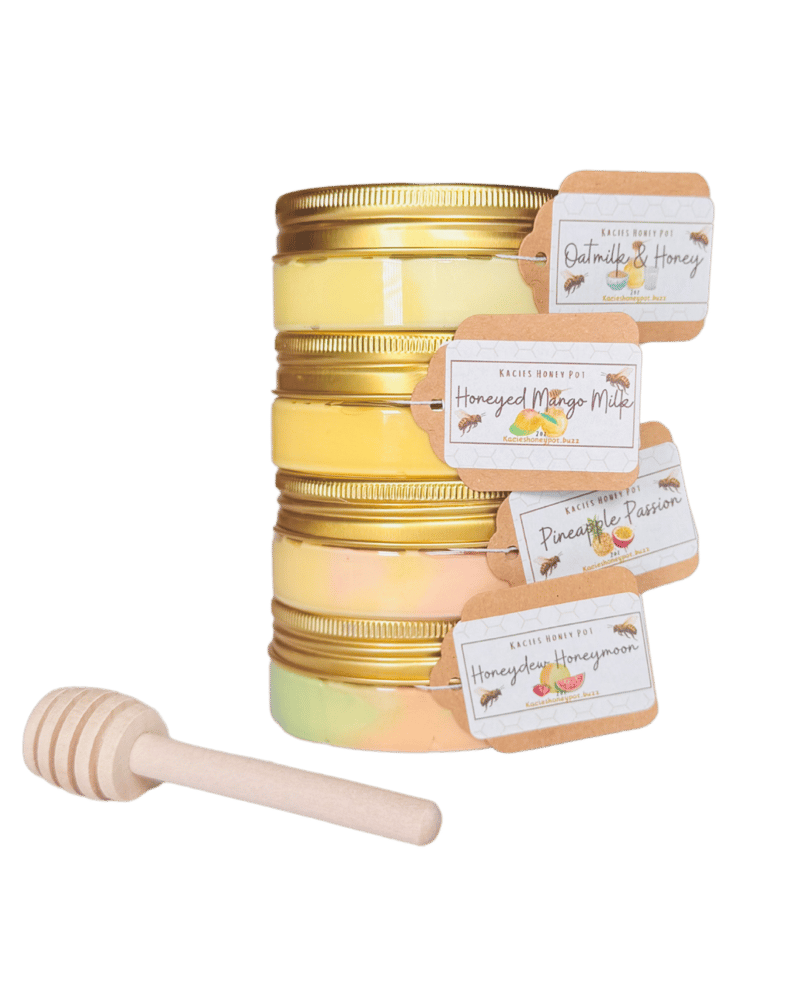 2oz mini bundle of butters that resemble sweet delicious goodness! Comes with one, Oatmilk & Honey 2oz, Honeyed Mango Milk 2oz, Pineapple Passion 2oz, and Honeydew Honeymoon 2oz! Whether itβs for on the go or to sample all the scents, mini bundles are a great way to get variety for you buzz! π